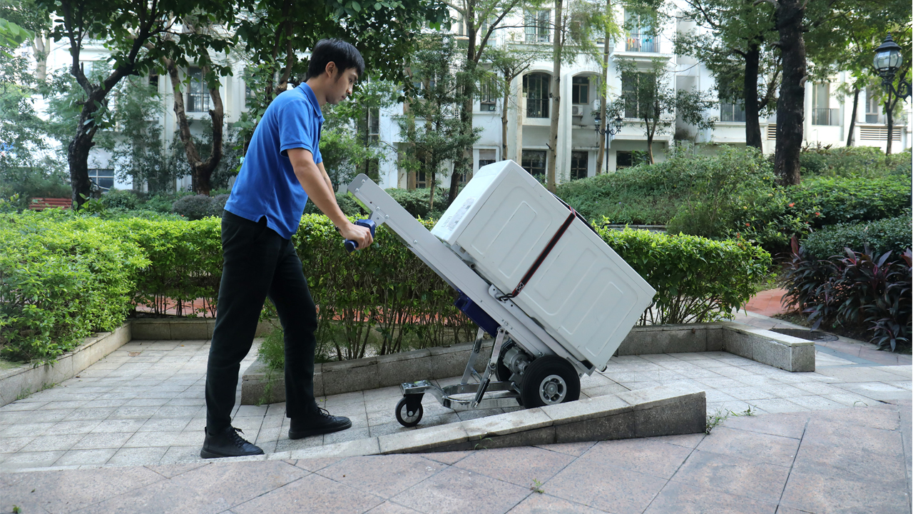 This hand truck features a lifting control handle for easy raising and lowering of loads, and a plug-and-play battery pack that boasts an auto-connection feature for hassle-free power management